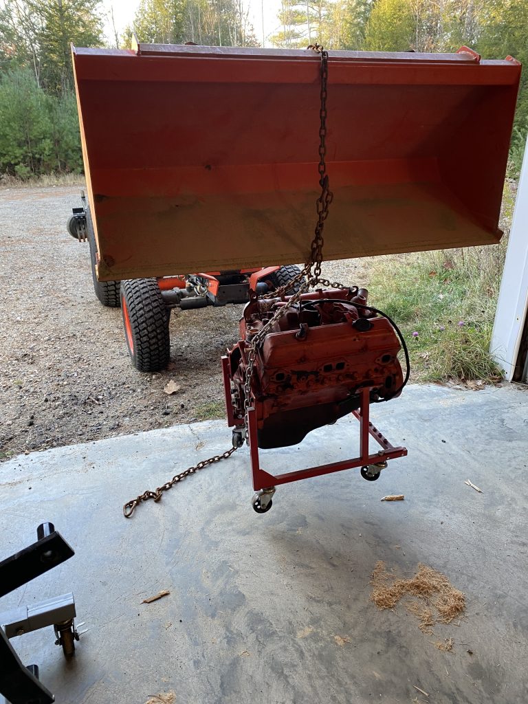 The engine came on a storage dolly, but I needed to attach it to a work stand instead. I didn’t have an engine hoist available, so the tractor got pressed into service to lift the engine so I could put it on the stand.